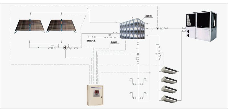 太陽能+空氣源結合系統,可解決冬季采暖、夏季制冷和全年熱水需求,節能率達80%。系統安裝方便、運行穩定、投資回報快、收益率高。