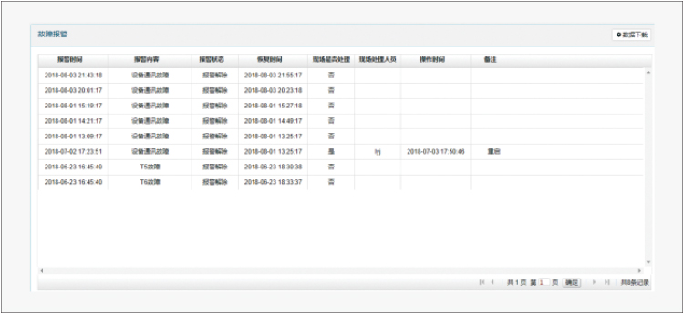 故障報警:顯示報警時間、內容,報警是否解除和恢復時間、現場是否處理以及現場處理人員、操作時間等。