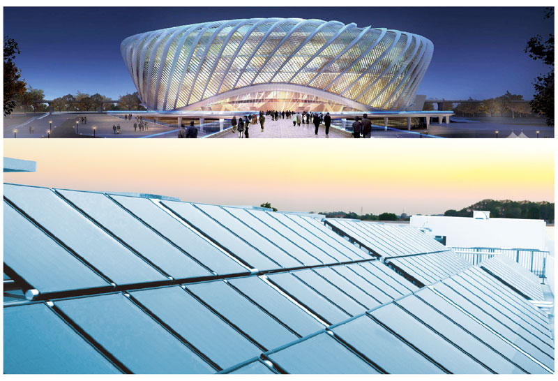 太陽能+地源熱泵三聯(lián)供系統(tǒng),冬季采暖、夏季制冷、全年熱水免費(fèi)用。太陽能利用率高,地源熱泵制熱效率年均4.0以上,運(yùn)行費(fèi)用低,節(jié)能減排,打造綠色、低碳體育場館。