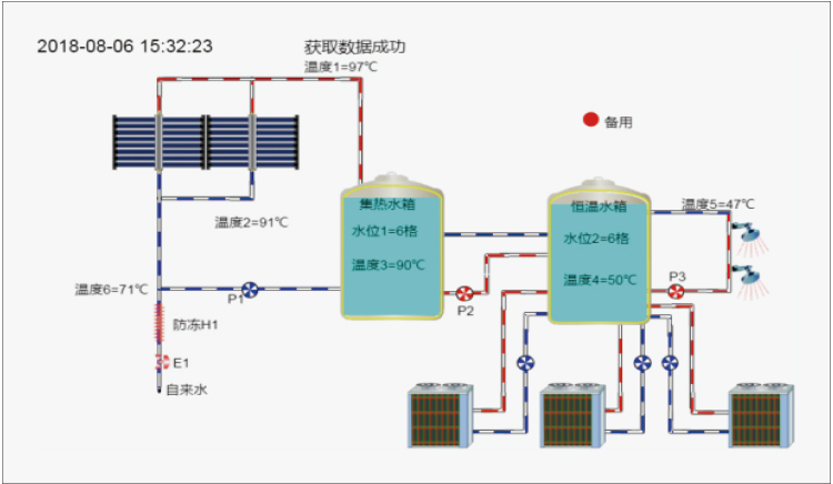 在線監(jiān)測:實(shí)時云圖窗口中為系統(tǒng)的運(yùn)行示意圖,圖中可以看到系統(tǒng)的動態(tài)運(yùn)行情況,包括各處的溫度值、水箱水位、水泵、電磁閥等設(shè)備是否開啟等。可以看到水流動、水泵的轉(zhuǎn)動等動畫。