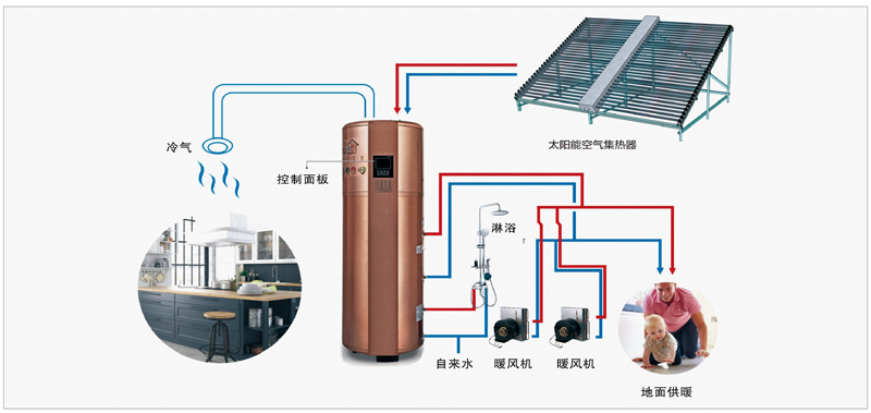 太陽能熱風集熱器+空氣源熱泵集合,太陽能為空氣源提供10~15℃熱空氣,提高空氣源熱泵運行效率,在冬季-20℃的環境下,空氣源熱泵COP值可達到3.0。可以實現冬季供暖、夏季制冷和全年熱水需求。大大降低了系統的運行費用,投資收益相當可觀。